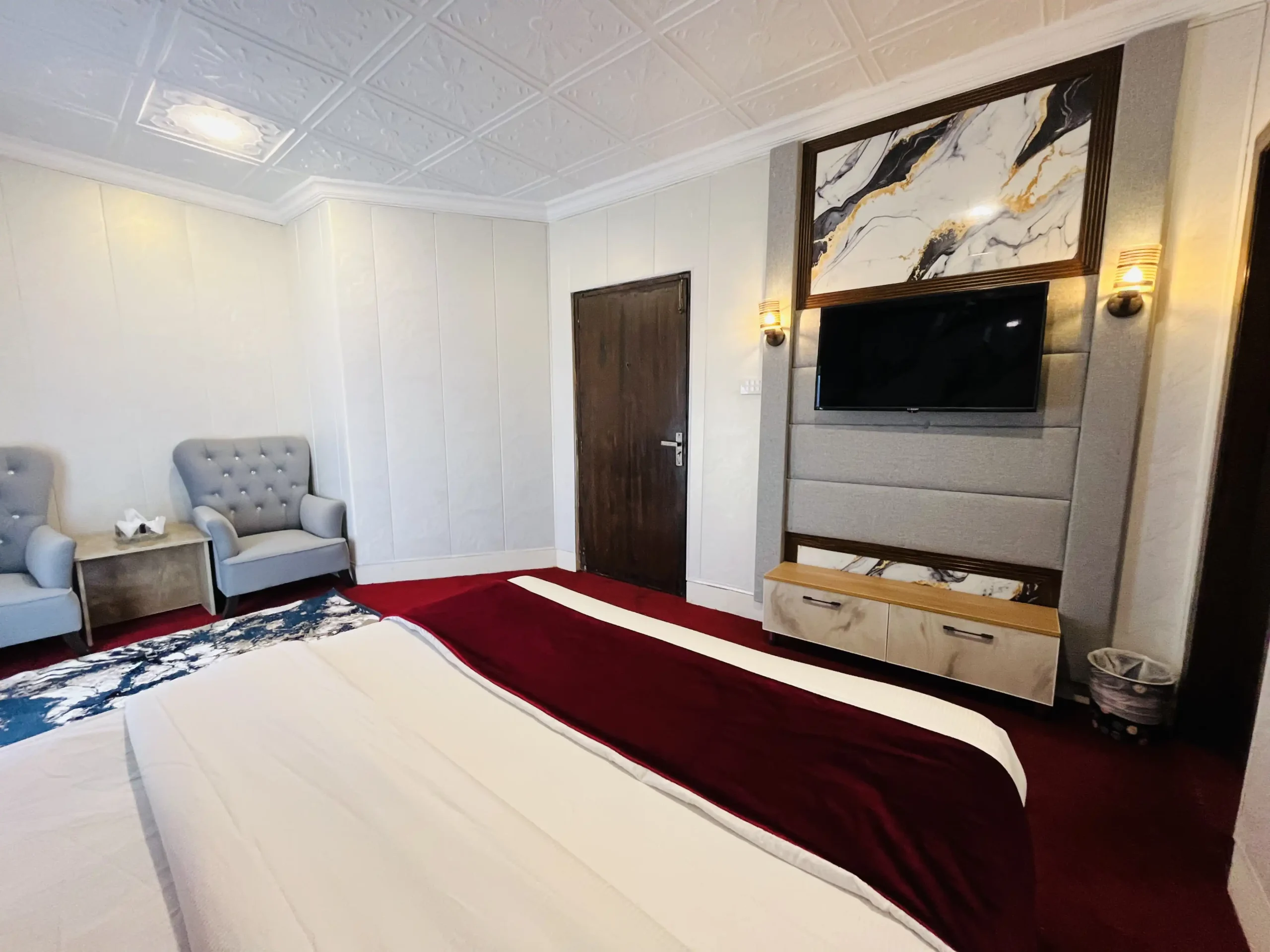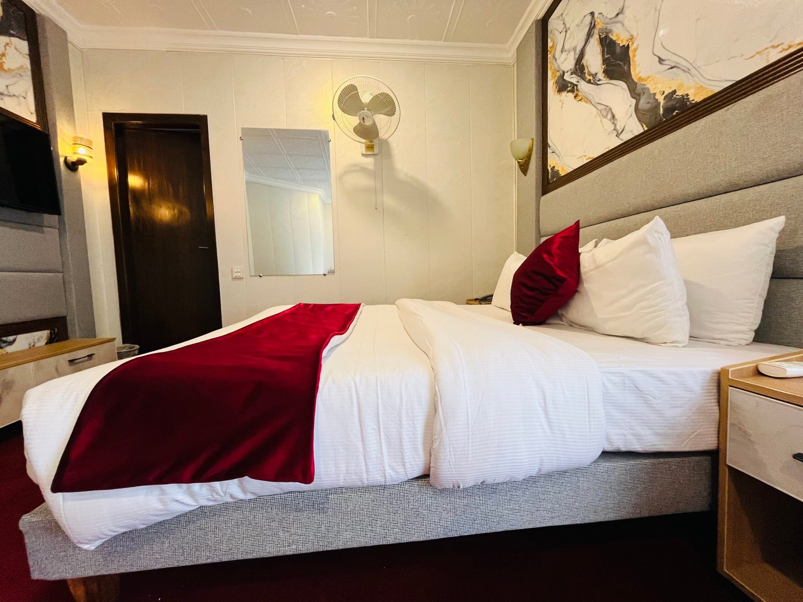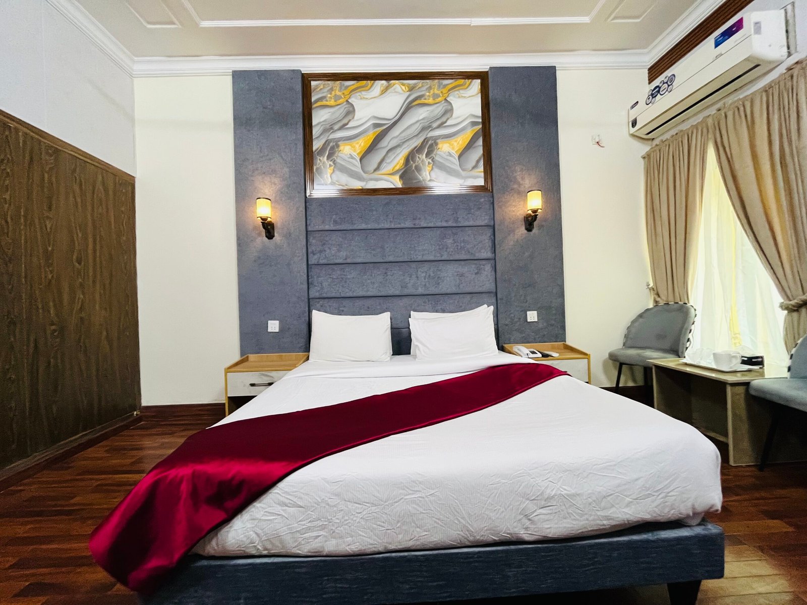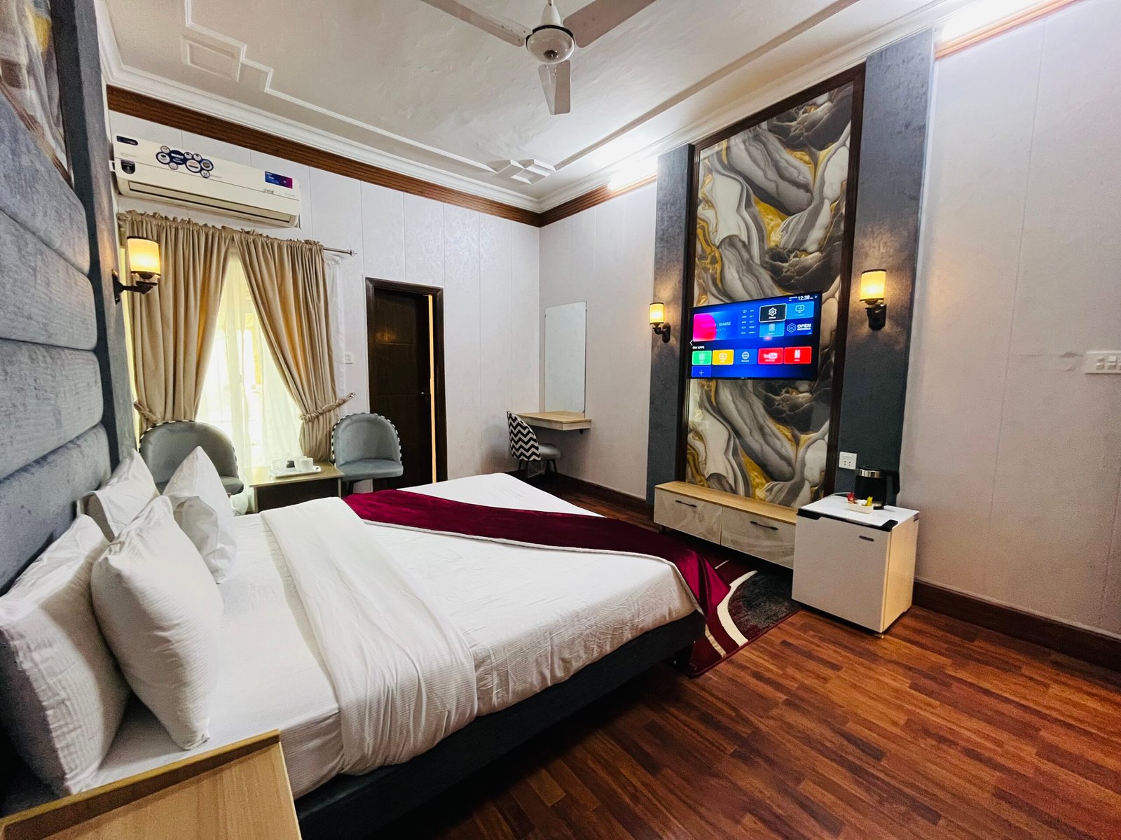 Relax in our Luxury Master Bedroom featuring a plush Queen Sized Bed. This premium room offers AC, High-Speed WiFi, Mini Bar, and a private bathroom. Enjoy 24/7 Power Backup, valet parking, and round-the-clock security in the heart of Islamabad.